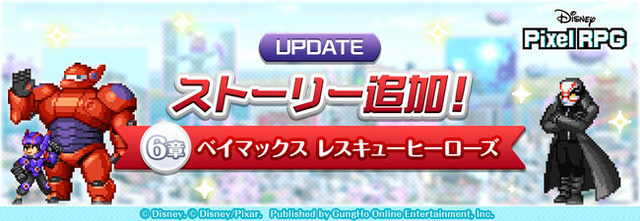 新ストーリー6章の舞台は、「ベイマックス」たちが暮らす「サンフランソウキョウ」にて繰り広げられるアクションゲーム「ベイマックス レスキューヒーローズ」の世界。異変が起こったゲームの世界を救うため、キャラクターたちとマネーバの謎を追う冒険を始めたプレイヤーは、ついに敵の本拠地へと向かいます。