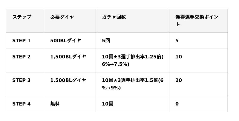 ※STEP1からSTEP4までの4段階があり、ガチャを引くことでSTEPが1段階上昇、STEPに応じて特典が変化します。また、ステップアップ選手ガチャで追加される選手交換ポイントはピックアップ選手ガチャに追加されます。