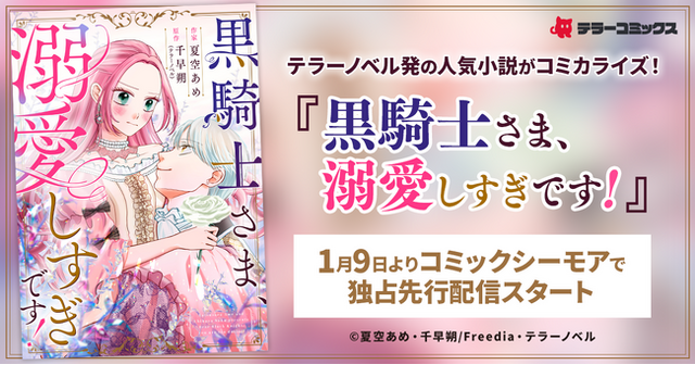株式会社テラーノベル(本社:東京都港区、代表取締役社長:蜂谷宣人)は、株式会社トーハン(本社:東京都新宿区、代表取締役社長:川上浩明)と共同設立したコミックレーベル「テラーコミックス」にて、テラーノベル発の人気小説を『黒騎士さま、溺愛しすぎです!』としてコミカライズし、コミックシーモアでの独占先行配信を2026年1月9日より開始することをお知らせいたします。