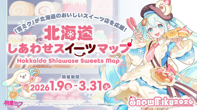 クリプトン・フューチャー・メディア株式会社(本社:北海道札幌市、代表取締役:伊藤博之、以下クリプトン)は、北海道を応援するキャラクター『雪ミク』のフェスティバル「SNOW MIKU 2026」の一環として、道内各地のスイーツ店とコラボレーションする企画「北海道しあわせスイーツマップ」(協力:札幌洋菓子協会/スイーツ王国さっぽろ推進協議会)の展開を開始いたしました。札幌市内の13店をはじめ、小樽市内の2店、函館市内の4店、さらには標茶町内の1店を加えた計20店舗が参加している、スイーツ店応援企画です。2026年1月9日(金)~3月31日(火)まで、参加店舗でのお会計が1,000円以上の方にコースター(全7種・ランダム)をお渡しするほか、一部店舗では『雪ミク』のイラスト入りピックが付いたコラボメニューも提供いたします。ぜひ、この機会に道内各地の北海道のスイーツをお楽しみください。