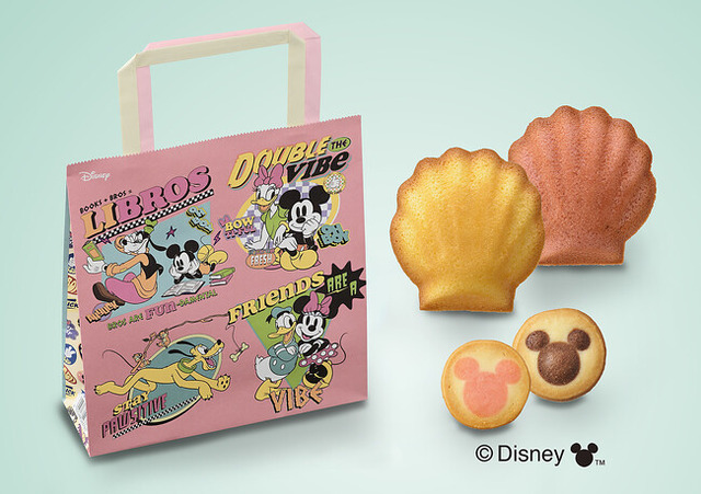 特長:「ミッキー」アイコン柄クッキーと、ふんわりしっとり焼き上げたマドレーヌ2種の詰め合わせです。バッグには、「ミッキーマウス」&「デイジーダック」、「ミニーマウス」&「ドナルドダック」など、いつもとは違うペアをワッペン風にデザイン。それぞれ読書したり、じゃれ合ったり、とっても楽しそう!