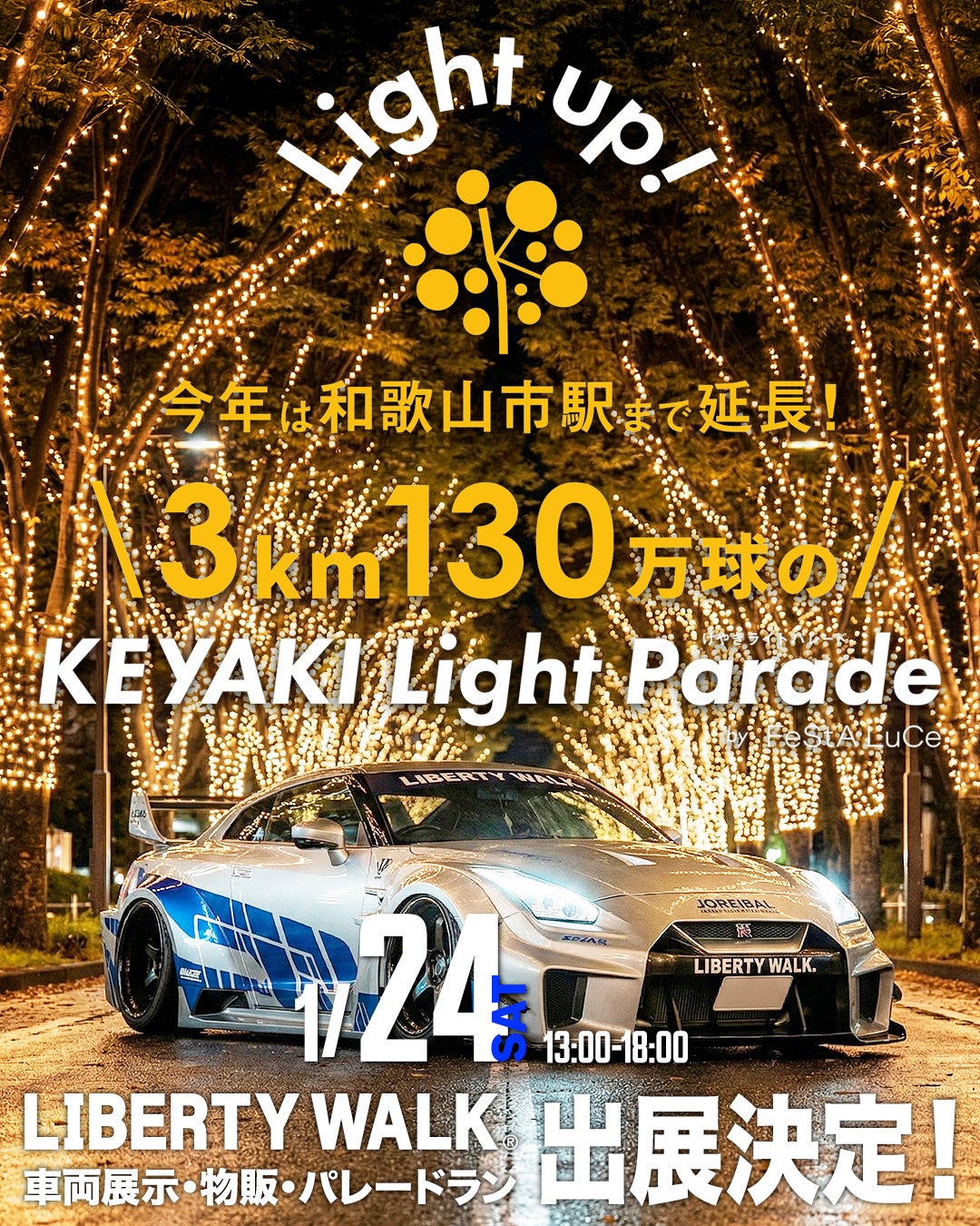 和歌山城西の丸広場では、約30台のカスタムされたスーパーカーを展示。「日本一のイルミネーションストリート・けやきライトパレード」でのパレードラン(南海和歌山市駅~JR和歌山駅間を2周)は必見。非日常の迫力ある光景をご覧いただけます。