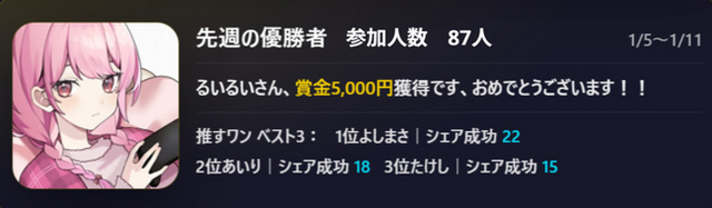 TOPになった配信者に最も貢献した「推すワン」も、週次で報酬を得ることができます。