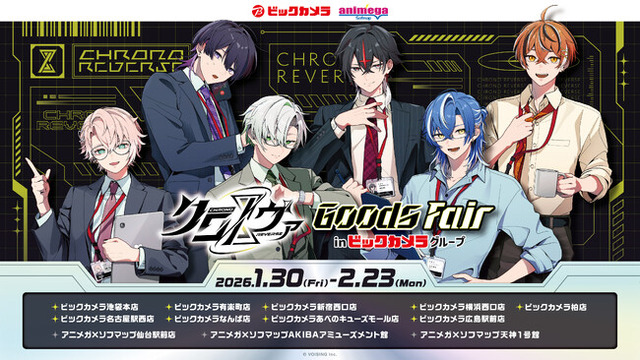 株式会社VOISING(本社:東京都港区、代表者:ないこ)所属の2.5次元アイドルグループ「クロノヴァ」は、株式会社ビックカメラおよび株式会社ソフマップにて、2026年1月30日(金)から2月23日(月)までの期間限定で『クロノヴァグッズフェア in ビックカメラグループ』を開催することが決定いたしました。家電販売店という”身近な場所を舞台に、クロノヴァの世界観を立体的に体感できるコラボレーションをお届けいたします。