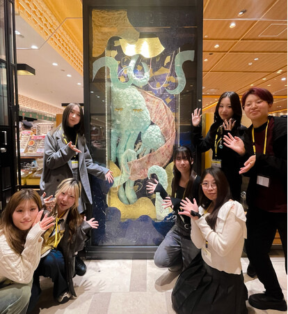 「最優秀賞」と「マイングお客さま投票賞」をダブル受賞した作品「未来への贈り物」と製作を担当した学生たち。