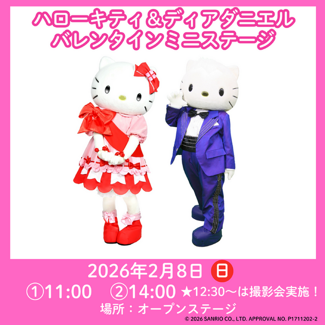 [画像4: https://prcdn.freetls.fastly.net/release_image/157222/99/157222-99-6f1c0f9ad034f66f8d7489dc84c29413-2380x2380.png?width=536&quality=85%2C75&format=jpeg&auto=webp&fit=bounds&bg-color=fff ]ハローキティとディアダニエルが登場し、バレンタイン限定のミニステージを開催します。