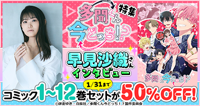 6,700作品以上のアニメが見放題(※)の「dアニメストア」( https://animestore.docomo.ne.jp/ )では、累計発行部数175万部を突破している人気コミック「多聞くん今どっち!?」のTVアニメ放送にあわせて、同作品の特集ページを公開しています。特集では、主人公・木下うたげ役を演じる早見沙織さんのインタビューを掲載。また、1月31日までの期間限定で、原作コミックの1~12巻セットが50%OFFで購入できるおトクなキャンペーンも開催中です。