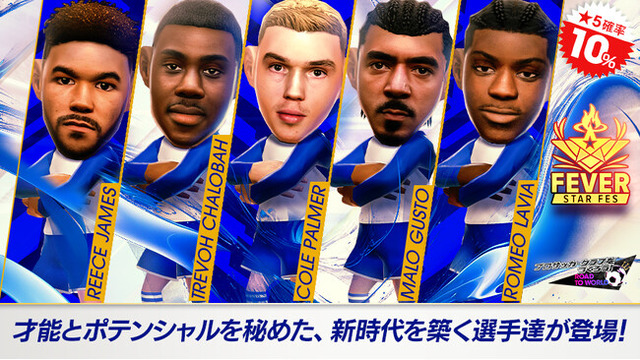 「コール・パーマー」「トレヴォ・チャロバー」「マロ・ギュスト」「リース・ジェームズ」「ロメオ・ラヴィア」といったイングランド強豪クラブのスーパースターが、得意戦術中央突破の新★5選手として登場する“FEVER STAR FES”を開催! あわせて、★4バージョンの選手たちがもらえる“スペシャルログインボーナス”も実施します。
