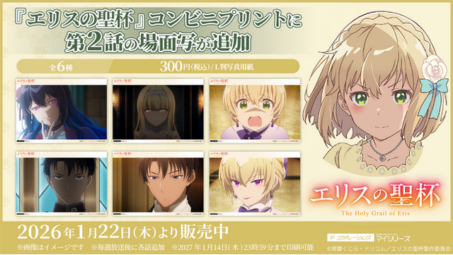 『エリスの聖杯』コンビニプリントでは、話題のキービジュアル、各キャラクターのイラストを使用したブロマイドやシールなど、美しいビジュアルを堪能することが出来るファンも納得のクオリティで提供します。場面写は各話放送終了1週間後の11:00以降に順次追加される予定です。