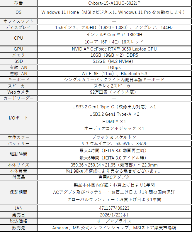 この度、エムエスアイコンピュータージャパン株式会社は、未来感あふれるサイバーパンクデザインと高性能を融合したゲーミングノートPC「Cyborg 15」シリーズより、「Cyborg-15-A13UC-6022JP」を本日2026年1月22日(木)より順次販売開始いたします。