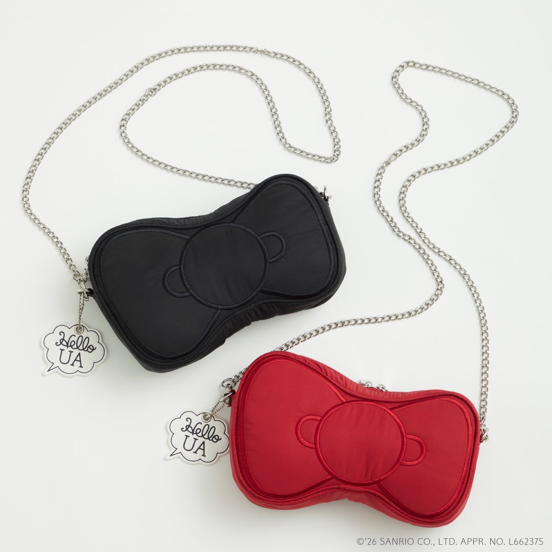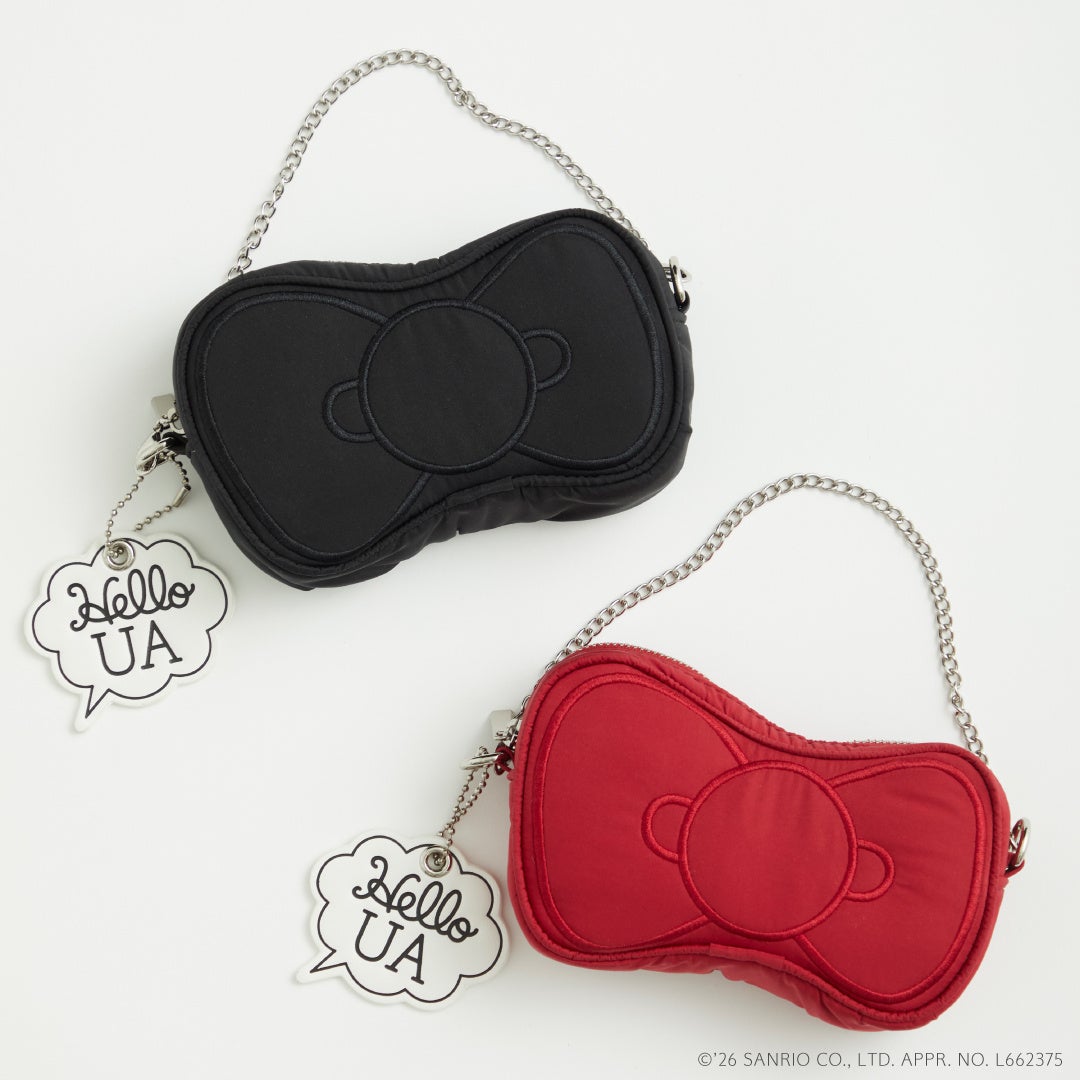 リボンポーチ / 価格:8,800円ハローキティのトレードマークのひとつであるリボンをポーチにしました。小物の収納にちょうど良いサイズ感で、リボンの愛らしいフォルムを活かしたデザインに仕上げました。取り外し可能なチェーン付きで、ミニバッグとしてはもちろん、バッグにチャーム感覚で付けてお楽しみいただけます。ハローキティと「ユナイテッドアローズ」のコラボレーションのためにデザインした「Hello UA」吹き出しモチーフのチャームがついています。