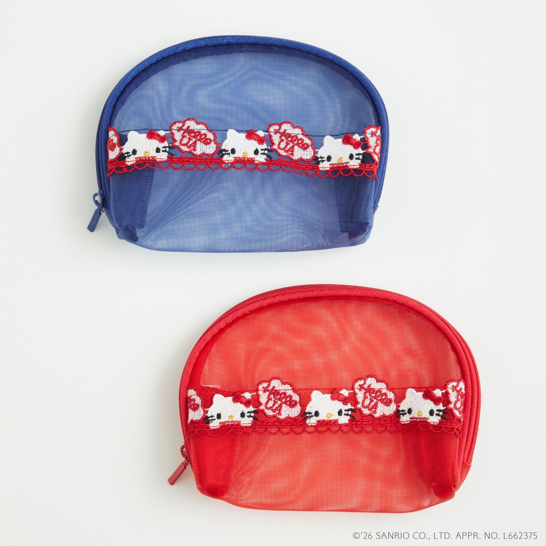 ポーチ / 価格:2,750円「近沢レース店」で定番のメッシュ小物シリーズより、懐かしい70年代をイメージしたハローキティを繊細なレースで表現したミニポーチ。小物類を持っておくのにぴったりなダブルファスナーの仕様で、2か所に分けて収納可能です。ビビッドな赤、青のメッシュと、かわいらしいハローキティの刺繍がアクセントになったアイテムです。