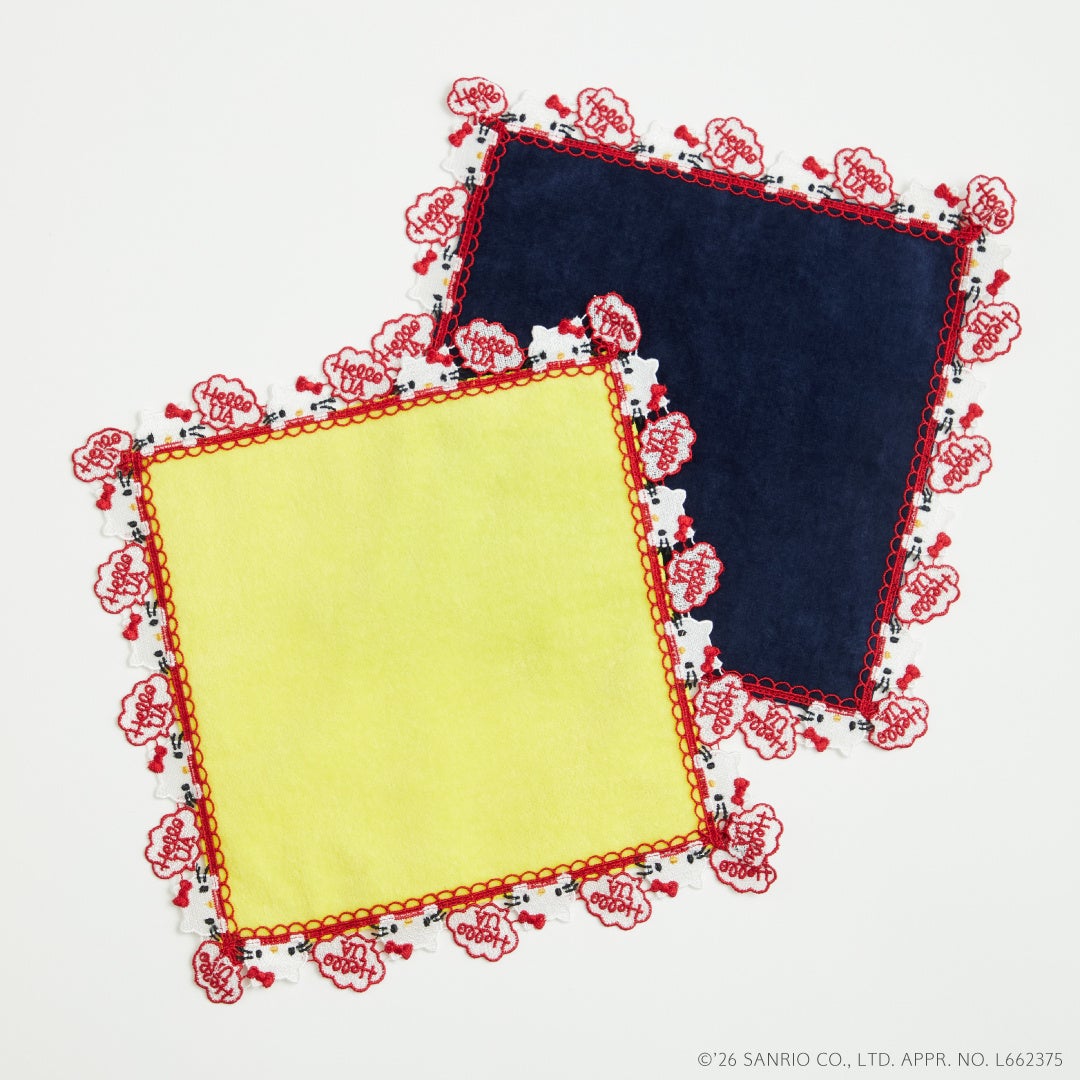 ハンカチ / 価格:3,850円70年代をイメージしたハローキティを繊細なレースで表現した1枚。かわいいお顔を覗かせて「HELLO UA」とごあいさつしています。白、赤、黒の3色の刺繍に、タオル地は深みのある落ち着いたネイビー、元気が出るビビッドなイエローの2色展開。バッグに入れていつでも一緒にお出かけが楽しめるアイテムです。