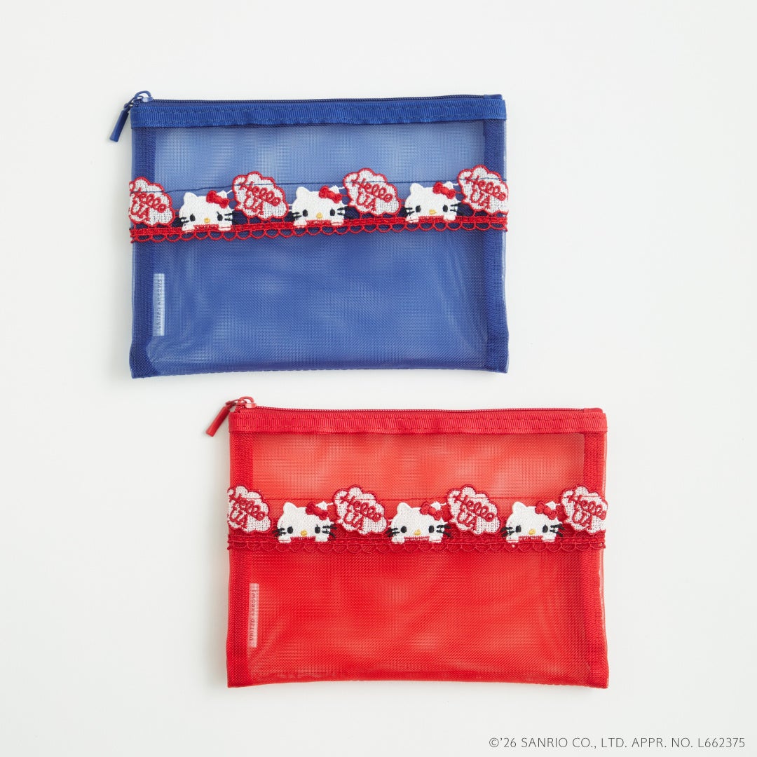 ポーチ / 価格:3,330円「近沢レース店」で定番のメッシュ小物シリーズより、懐かしい70年代をイメージしたハローキティを繊細なレースで表現したミディアムポーチ。マチがなくフラットなシルエットで内側にポケットがついており、メイク道具などの携帯にも、パスポートや手帳などを持っていくのにもおすすめなサイズ。ビビッドな赤、青のメッシュと、かわいらしいハローキティの刺繍がアクセントになったアイテムです。