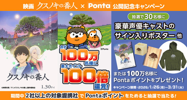 共通ポイントサービス「Ponta(ポンタ)」を運営する株式会社ロイヤリティ マーケティング(本社:東京都渋谷区、代表取締役社長:勝 文彦、以下「LM」)は、東野圭吾原作作品の初のアニメーション映画『クスノキの番人』の公開を記念し、2026年1月26日(月)~3月31日(火)、Pontaポイントや映画のグッズをプレゼントするキャンペーンを実施します。