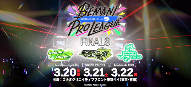 株式会社コナミアーケードゲームスは、『BEMANI PRO LEAGUE -SEASON 5-(ビーマニ プロ リーグ シーズンファイブ)』の優勝チームを決定するイベント「BEMANI PRO LEAGUE -SEASON 5- FINALS(ビーマニ プロ リーグ シーズンファイブ ファイナルズ)」を、3月20日(金・祝)から3月22日(日)の3日間にわたり、「コナミクリエイティブフロント東京ベイ」(東京都 江東区)にて開催することをお知らせします。
