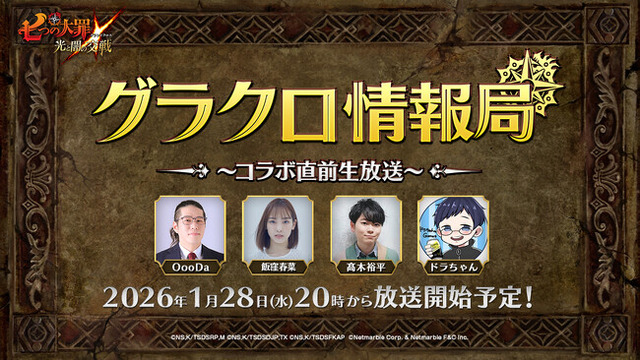 ネットマーブルは、 スマートフォン向けシネマティックアドベンチャーRPG『七つの大罪 ~光と闇の交戦(ひかりとやみのグランドクロス)~』(略称:グラクロ)の公式WEB番組「第76回 グラクロ情報局 ~コラボ直前生放送~」を、1月28日(水)20:00より、生放送することをお知らせいたします。