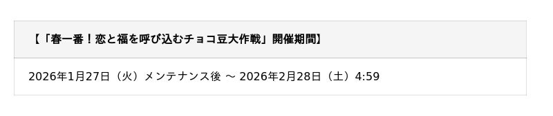 【期間】2026年1月27日(火)メンテナンス後 ~ 2026年2月2日(月)12:00頃まで