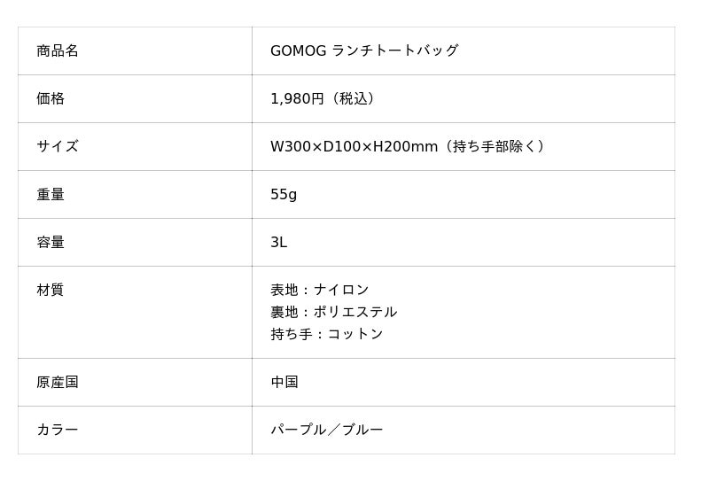 【GOMOG ランチトートバッグの特徴】