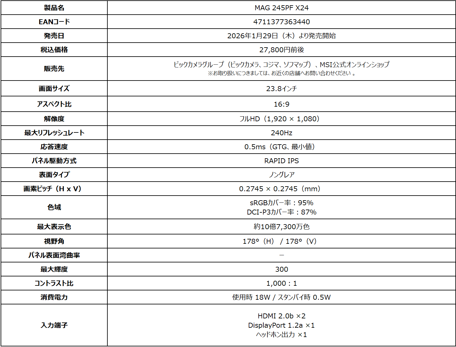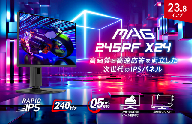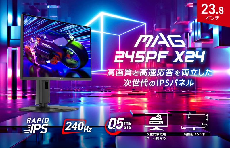 この度、エムエスアイコンピュータージャパン株式会社は2026年1月29日(木)より、ゲーミングモニターの新モデルをビックカメラグループ(ビックカメラ、コジマ、ソフマップ)、MSI公式オンラインショップにて発売いたします。高いゲーミング性能とコストパフォーマンスに優れた『MAG』シリーズから、240Hzの高リフレッシュレートと応答速度0.5ms(GTG、最小値)を実現するRAPID IPSパネルを採用し、よりゲームを楽しめるAIビジョン等のゲーマー向け機能、高性能スタンドによる柔軟な設置にも対応した「MAG 245PF X24」が新たにラインナップに加わります。