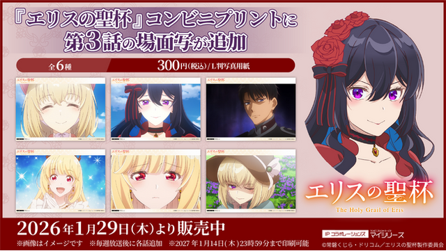 『エリスの聖杯』コンビニプリントでは、話題のキービジュアル、各キャラクターのイラストを使用したブロマイドやシールなど、美しいビジュアルを堪能することが出来るファンも納得のクオリティで提供します。場面写は各話放送終了1週間後の11:00以降に順次追加される予定です。
