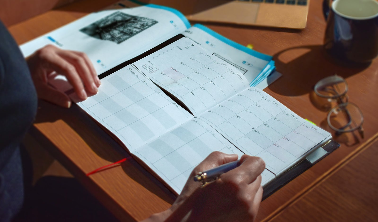月間ページは折りたたみ式で、どの週ページを見ていても同時に確認できる画期的な仕様です。タスクの多い社会人、家族の予定を管理する主婦層に絶賛されています。特殊な工程を必要とするため、製本技術に自信のある手帳メーカーだから実現した仕様です。