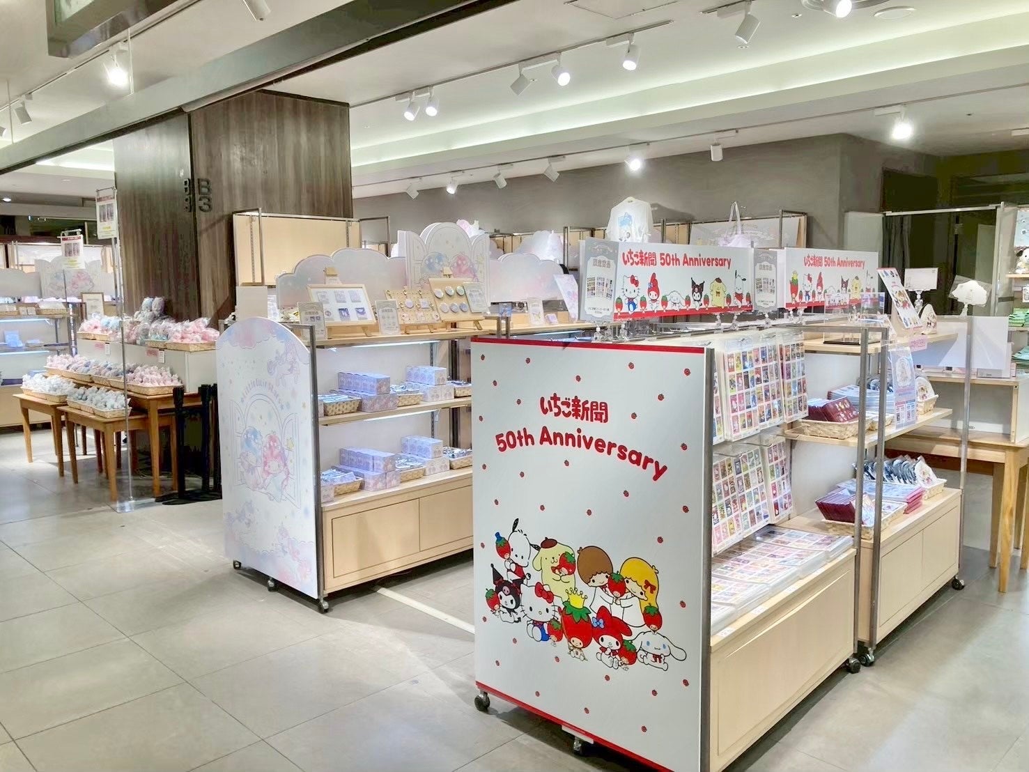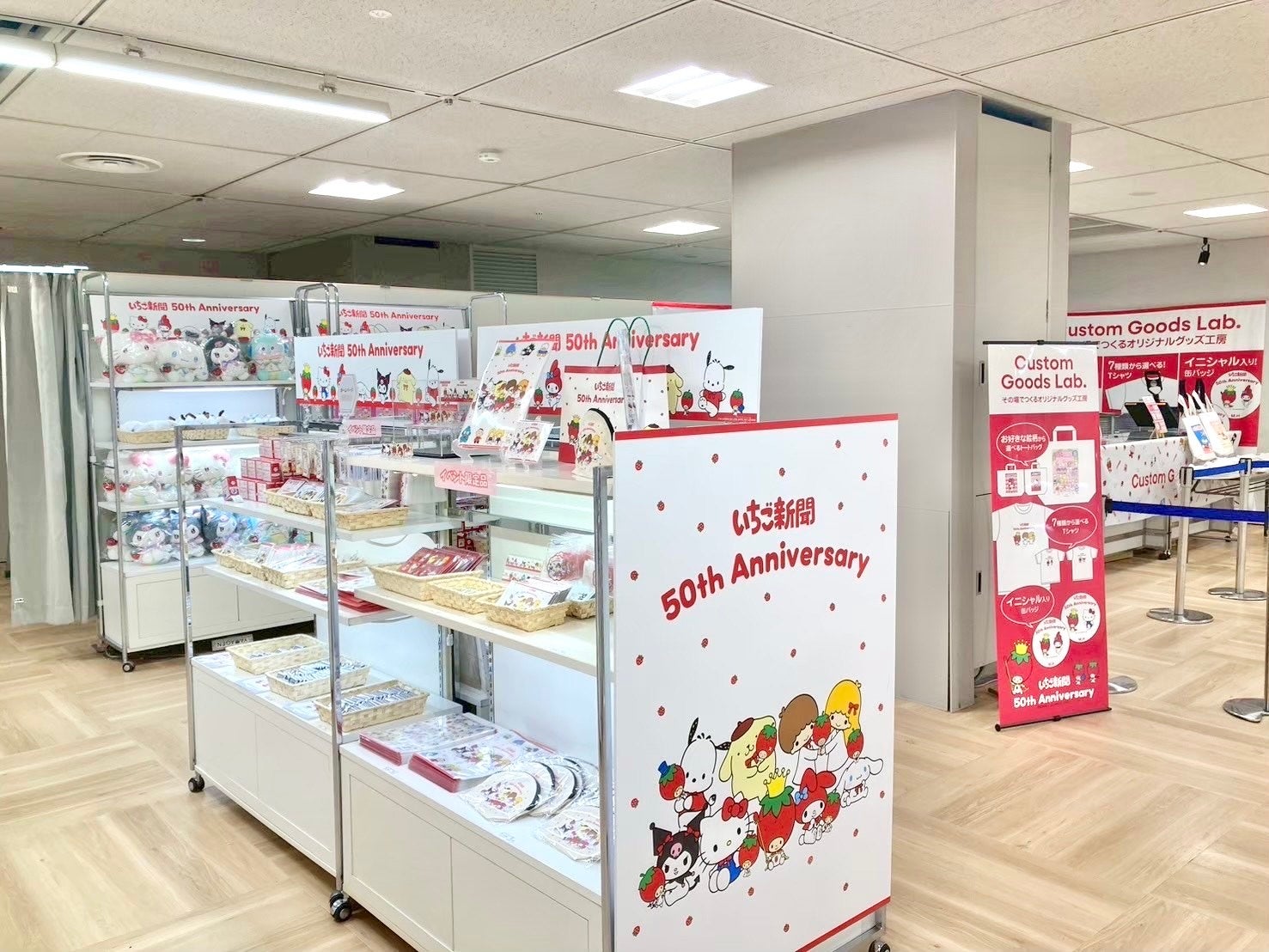 会場ごとに、アニバーサリーイヤーとなる3キャラクター(マイメロディ&クロミ、リトルツインスターズ)と、月刊いちご新聞をメインとしたコーナーを設置。上記以外にもサンリオキャラクターズのグッズを多く販売いたしました。