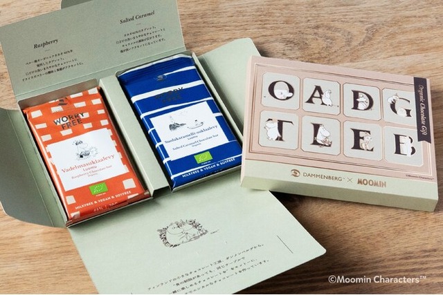 今回のポップアップストアのメイン商品となるオリジナルギフトボックスは、タブレット(板チョコ)の2種「有機ラズベリーチョコレート」と「有機ソルトキャラメルチョコレート カカオ」が包まれた手紙のような仕様が特徴です。ムーミンの人気キャラクターを主役に据えた、特別なデザインに仕上げました。