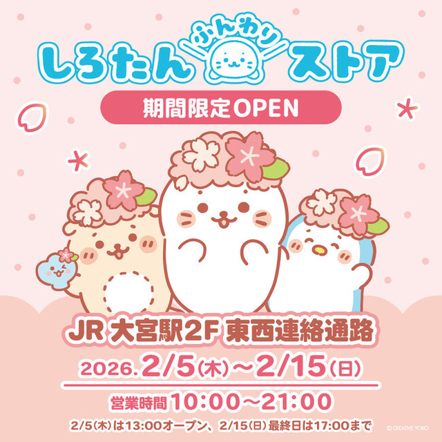 株式会社クリエイティブヨーコ(本社:長野県長野市 代表取締役社長:北原 武幸)は、オリジナルキャラクター『しろたん』の期間限定ポップアップストア「しろたんふんわりストア」を、JR大宮駅2F東西連絡通路にて、2026年2月5日(木)から2月15日(日)まで開催します。