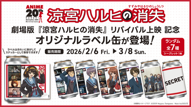 エンターテインメント商品・サービスの企画・開発を行う株式会社スペースファクトリー(本社:東京都千代田区)は2026年2月6日(金)よりリバイバル上映を開始する劇場版『涼宮ハルヒの消失』のTAG LIVE LABEL(オリジナルラベル缶)を、全国のサントリー自販機で2月6日(金)より順次販売開始いたします。