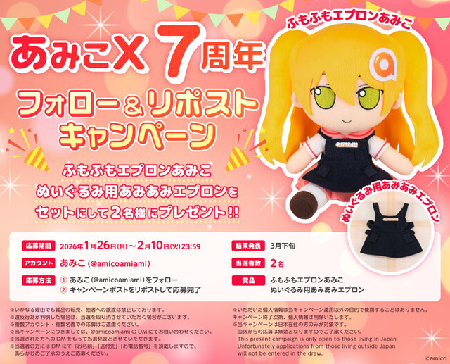 大網株式会社(本社・東京都文京区)は、自社が運営するホビーショップ「あみあみ」看板娘『あみこ』のXアカウント7周年を記念して、「ふもふもエプロンあみこ」「ぬいぐるみ用あみあみエプロン」をセットでプレゼントするフォロー&リポストキャンペーンをXで開催中です。