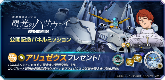 株式会社バンダイナムコエンターテインメントから配信中のApp Store/Google Play向けスマートフォンアプリ『SDガンダム ジージェネレーション エターナル』にて、『機動戦士ガンダム 閃光のハサウェイ キルケーの魔女』の劇場公開を記念して、SSRユニット「アリュゼウス」、SSRキャラクター「レーン・エイム」をプレゼントいたします。