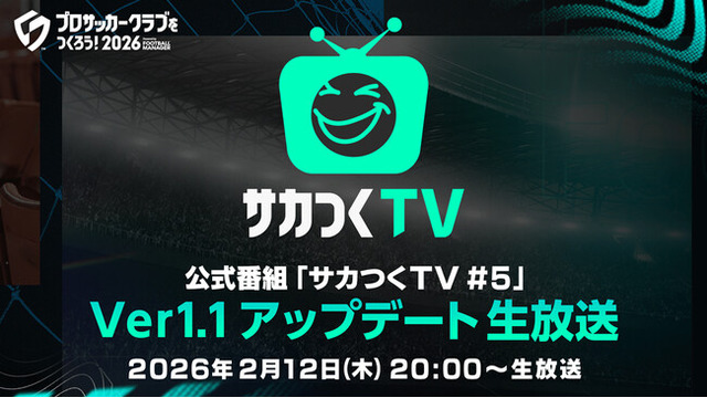 株式会社セガは、PlayStation(R)5/PlayStation(R)4/iOS/Android/PC(Steam)向けゲーム『プロサッカークラブをつくろう!2026』(以下、『サカつく2026』)について、最新情報をお届けする公式番組「サカつくTV#5」Ver.1.1アップデート生放送を、2026年2月12日(木)20時より公式YouTubeチャンネルにて配信することを決定しました。