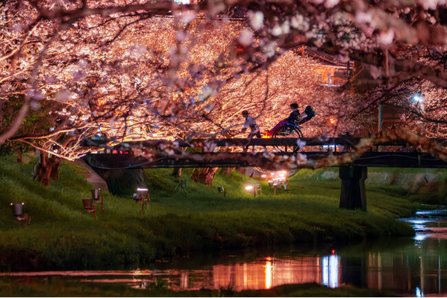 2kmにわたり夜桜が咲き誇る温泉街を人力車で巡る様子