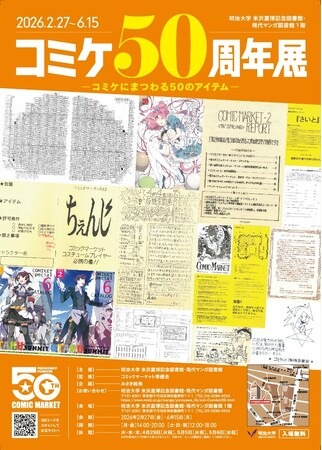 明治大学 米沢嘉博記念図書館は、2026年2月27日(金)から6月15日(月)までの期間、企画展「コミケ50周年展-コミケにまつわる50のアイテム-」を開催します。入場は無料です。