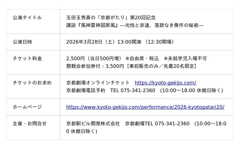 記念すべき第20回では、初回公演で好評を博し、幻の第1回目として再演のご要望も多かった題材、講談『風神雷神図屏風』を再演。二人の天才にまつわる日本美術史のミステリーを、玉田玉秀斎が語ります。さらに、京都の歴史文化に精通する「らくたび」代表・若村亮氏による、ゆかりの地の解説も併せてお楽しみいただけます。
