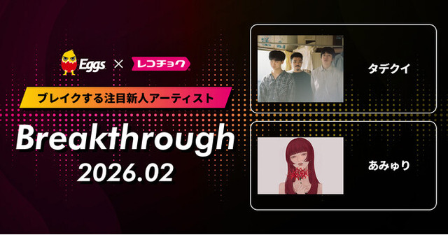 株式会社レコチョク(本社:東京都渋谷区、代表取締役社長:板橋徹、以下レコチョク)は、今後ブレイク必至の注目新人アーティストをレコメンドする取り組みとして毎月2組を「Breakthrough」として選出、2026年2月度の「Breakthrough 2026.2」を公開しました。