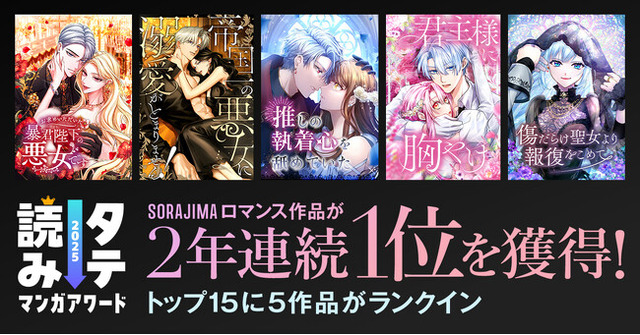 「タテ読みマンガアワード」は、コミックナタリーが主催する、縦スクロール形式のマンガを対象としたユーザー参加型のマンガ賞です。ユーザー投票によって選出される「国内作品部門」において、SORAJIMAのロマンス編集部が制作・配信する作品が、下記のとおり多くのご支持をいただきました。第1位:『お求めいただいた暴君陛下の悪女です』