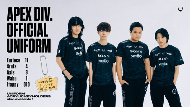本発表にあわせて、REJECT Apex Legends部門の新ユニフォームを販売いたします。販売価格、サイズ展開などの詳細は、REJECT公式オンラインストアよりご確認ください。