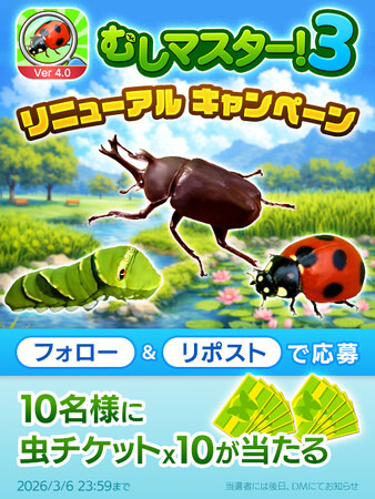 もりみらい株式会社(代表取締役社長:亀田恭平)では、虫探し&コレクションゲームアプリ「むしマスター!3」の大型アップデートをリリース。それに伴い、リニューアル記念キャンペーンを開催いたします。
