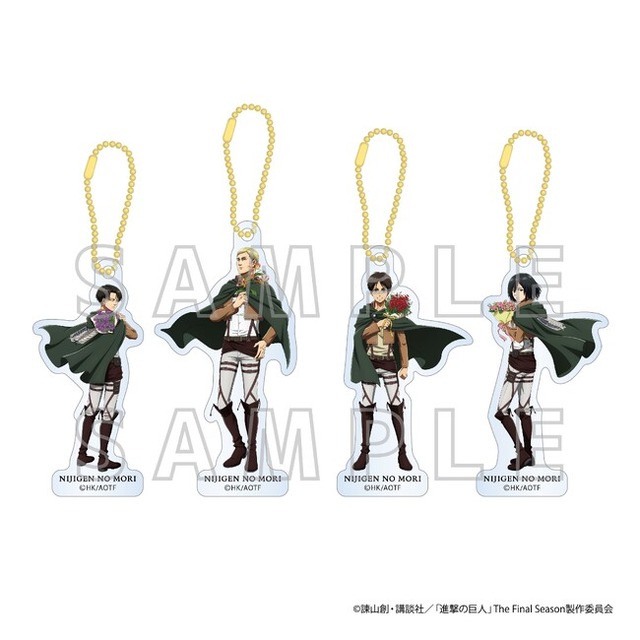 そしてこの度、イベント開始と同時に販売する第1弾オリジナルコラボグッズの発売が発表となりました。今回、オリジナル描き下ろしとなったエレンやミカサ、リヴァイ、エルヴィンたちが缶バッジやアクリルスタンドとなって登場。さらに、オリジナルイラストの巨人たちもハンカチやアクリルキーホルダー、エコバッグなどで登場します。その他、「リヴァイ兵士長のセリフメモ」や「アルミンの“一生かけても取りつくせないほどの”塩」など、ファン必見で小ネタ満載のオリジナルグッズ全36アイテムを販売いたします。