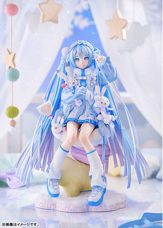 『キャラクター・ボーカル・シリーズ01 初音ミク』より、雪ミク スカイタウンオープン10周年を記念してイラストレーターのiXima氏によって描かれた記念ビジュアルが1/7スケールフィギュア化。ふわふわのクッションのうえにちょこんと座った雪ミクを、ラビット・ユキネや可愛い小物達と一緒に丁寧に立体化いたしました。スノードームのようにキラキラな瞳や繊細に仕上げた髪の毛のパール感など、様々な角度からお楽しみいただけるフィギュアとなっています。Anniversaryな雪ミクを是非お手元にお迎えください。