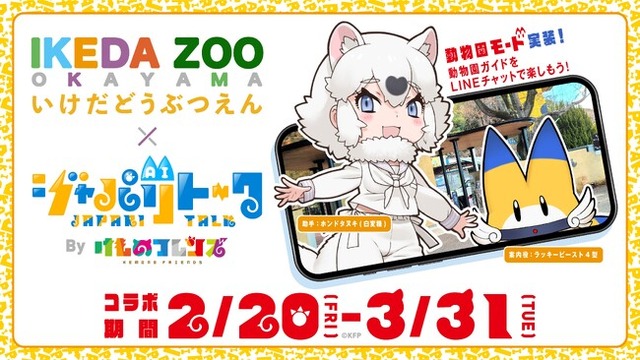 株式会社博報堂(本社:東京都港区、代表取締役社長:名倉健司、以下 博報堂)は、2024年に開発したメディアミックス作品『けものフレンズ』公式AIグループチャットサービス「ジャパリトーク」を拡張し、動物園の来園者がLINE上で、キャラクターと一緒に動物について楽しく学べる、新しい解説サービスを開発しました。導入第一弾として、「ジャパリトーク 動物園モード 池田動物園編」を、岡山県岡山市の池田動物園にて、2月20日(金)から3月31日(火)まで提供いたします。