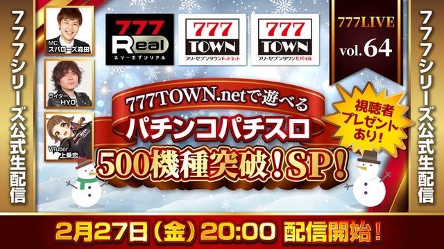 株式会社サミーネットワークスは、パチンコ・パチスロがパソコン、スマホで打てる「777TOWN(スリーセブンタウン)」、無料で遊んで豪華景品がもらえるスマホ向けサービス「777Real(スリーセブンリアル)」の生配信を、2026年2月27日(金)20時から配信いたします。