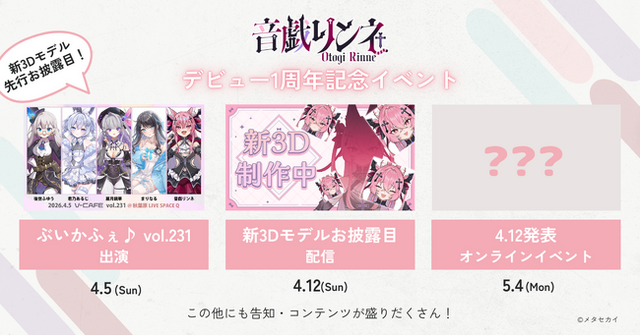 「メタセカイ」(運営:株式会社VSTA、代表取締役:岡田光輝)は、所属タレント「音戯リンネ」のデビュー1周年を記念して26年4月5日(日)より「音戯リンネデビュー1周年記念イベント」を開催することをお知らせいたします。