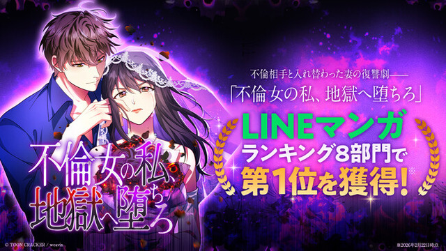 株式会社トゥーンクラッカー(本社:東京都目黒区、代表取締役社長:桑田栄顕)が原作・制作を担当したオリジナル作品『不倫女の私、地獄へ堕ちろ』が、LINE Digital Frontier株式会社が運営するLINEマンガにて2月22日(日)より配信を開始し、連載初日に、