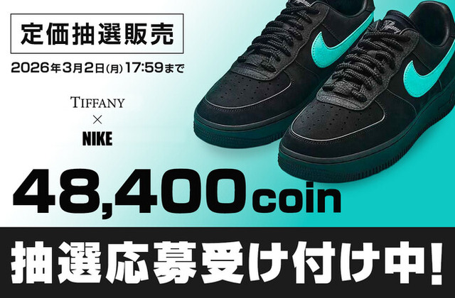 見事1等に当選された方には、入手困難な「Tiffany & Co. x Nike Air Force 1 Low "1837"(サイズ:27cm、28cm)」を定価(48,400コイン)で確実に購入できる権利が付与されます。