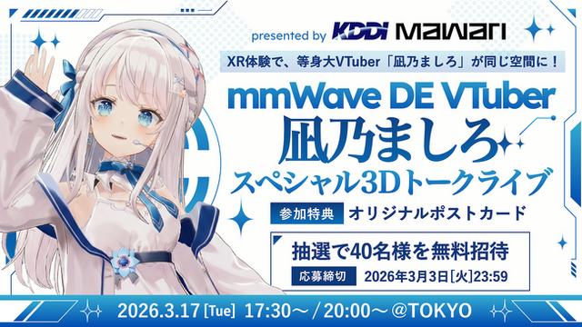 株式会社Mawari(本社:東京都渋谷区、以下 Mawari)は、KDDI株式会社(本社:東京都港区、以下 KDDI)と2026年3月17日(火)に開催する、5Gミリ波を活用した次世代XRイベント「mmWAVE DE VTuber presented by KDDI×Mawari ~凪乃ましろスペシャル3Dトークライブ」において、コアテクノロジーパートナーとして参画することをお知らせいたします。