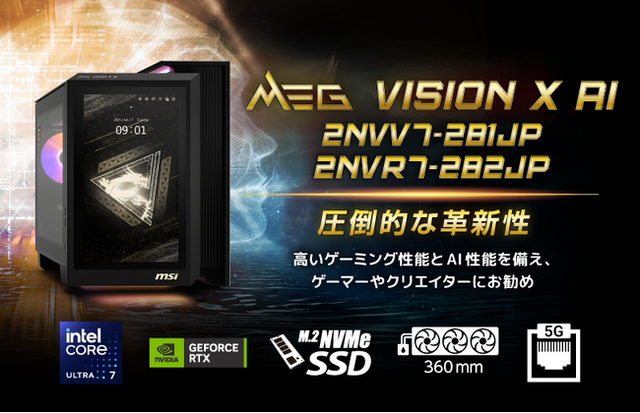 前面に13.3インチのタッチパネル、最新のDLSS 4.5のマルチフレーム生成に対応したNVIDIA(R) GeForce RTX(TM) 5080を搭載し、大容量64GBメモリ、5G LAN・Wi-Fi 7の高速通信機能を備えた「MEG Vision X AI 2NVV7-281JP」、RTX 5070 Tiを搭載した「MEG Vision X AI 2NVR7-282JP」が新たにラインナップに加わります。