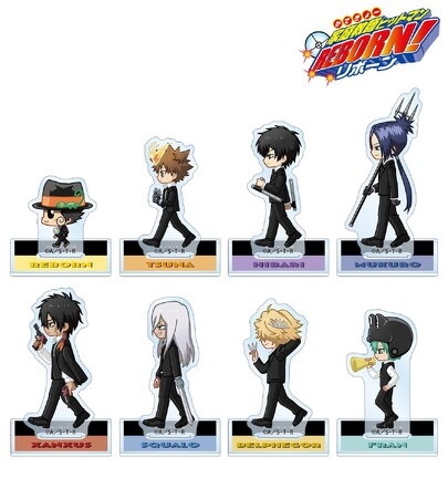 リボーン、沢田綱吉、雲雀 恭弥(10年後)、六道 骸(10年後)、XANXUS(10年後)、スペルビ・スクアーロ(10年後)、ベルフェゴール(10年後)、フランが歩いているちびキャラを新たに描き起こし、ゆらゆら動くアクリルキーホルダーに仕上げました。